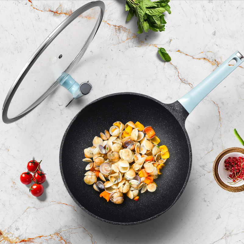 产品名称:火山石聚油不粘炒锅/玻璃盖可立