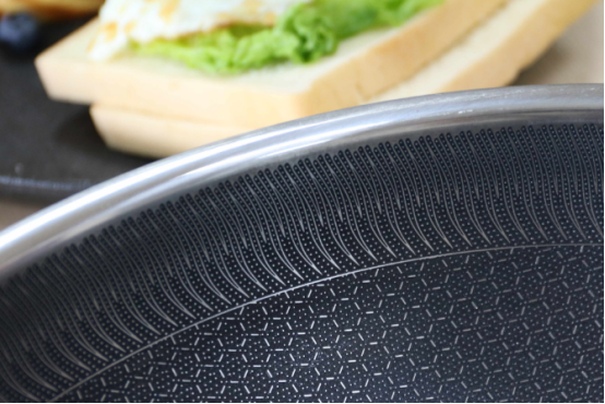 炒锅内壁有很多蜂巢形状的花纹。我原以为这样的设计是为了让它的颜值看起来不会过于单调,后来我才知道,加入蜂巢纹路的目的是提升炒锅的防黏性。比如,炒鸡蛋的时候,就算不放油也非常丝滑,完全不会产生鸡蛋液黏在锅上要用钢丝刷才能刷干净的尴尬。