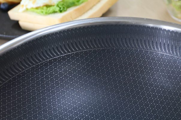 炒锅内壁有很多蜂巢形状的花纹。我原以为这样的设计是为了让它的颜值看起来不会过于单调,后来我才知道,加入蜂巢纹路的目的是提升炒锅的防黏性。比如,炒鸡蛋的时候,就算不放油也非常丝滑,完全不会产生鸡蛋液黏在锅上要用钢丝刷才能刷干净的尴尬。