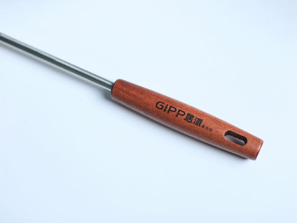 不锈钢锅铲除了铲面做了半孔面设计,方便不同菜肴翻炒,锅铲柄采用木头材质,隔热也更有质感。
