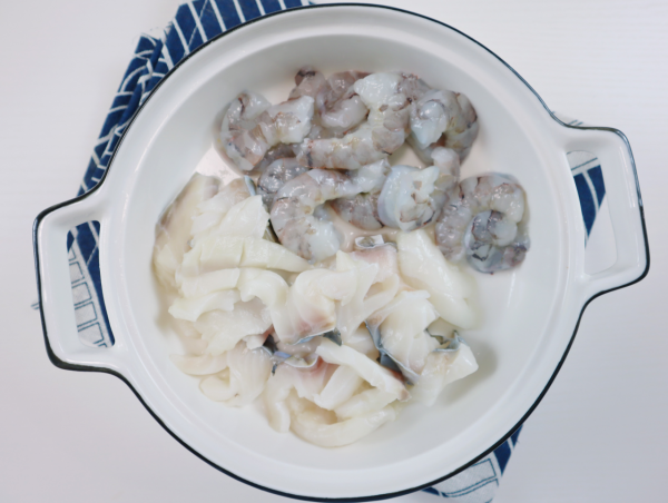 倒入虾仁、鱼片、鸡蛋