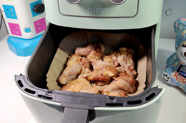 空气炸锅需要先预热5分钟,再把鸡中翅放入空气炸锅中,180℃烤个15分钟,抽出炸锅,翻面再刷一层酱料后再炸5分钟左右。