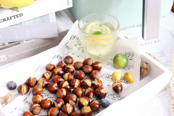 来烤个栗子。现在正好是福建锥栗的季节,香香脆脆的栗子配上一杯柠檬水,简直完美。烤栗子我试了两种方法:一种是将生的栗子直接放进GiPP居派空气炸锅烤,刚刚出炉热乎乎的状态下味道很不错。